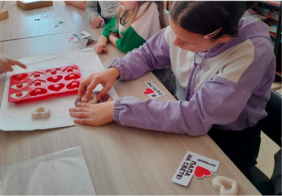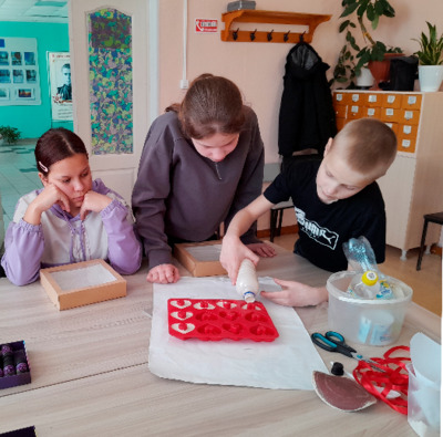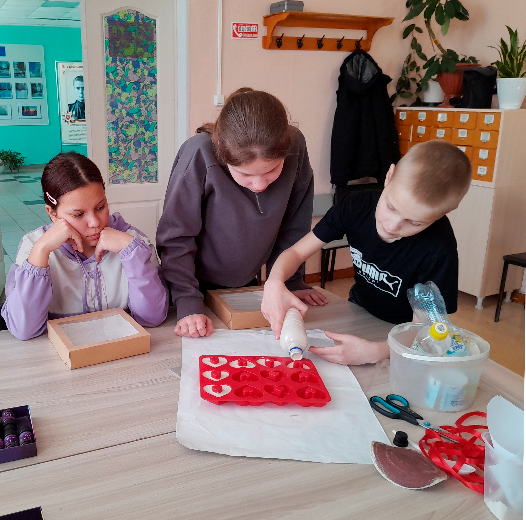 В ходе первого мероприятия дети смастерили гипсовые ароматизаторы-сердечки. Ребята узнали правильные пропорции гипса и воды, выбрали ароматное масло для изделия, заливали смесь в формы.