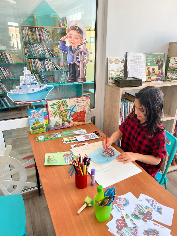 На мастер-классе по рисованию «Гордимся нашей армией!» проявить творческие способности и сделать приятный подарок своими руками для пап, братьев, дедушек получилось у юных пользователей детской модельной библиотеки в клубе «Улыбка».